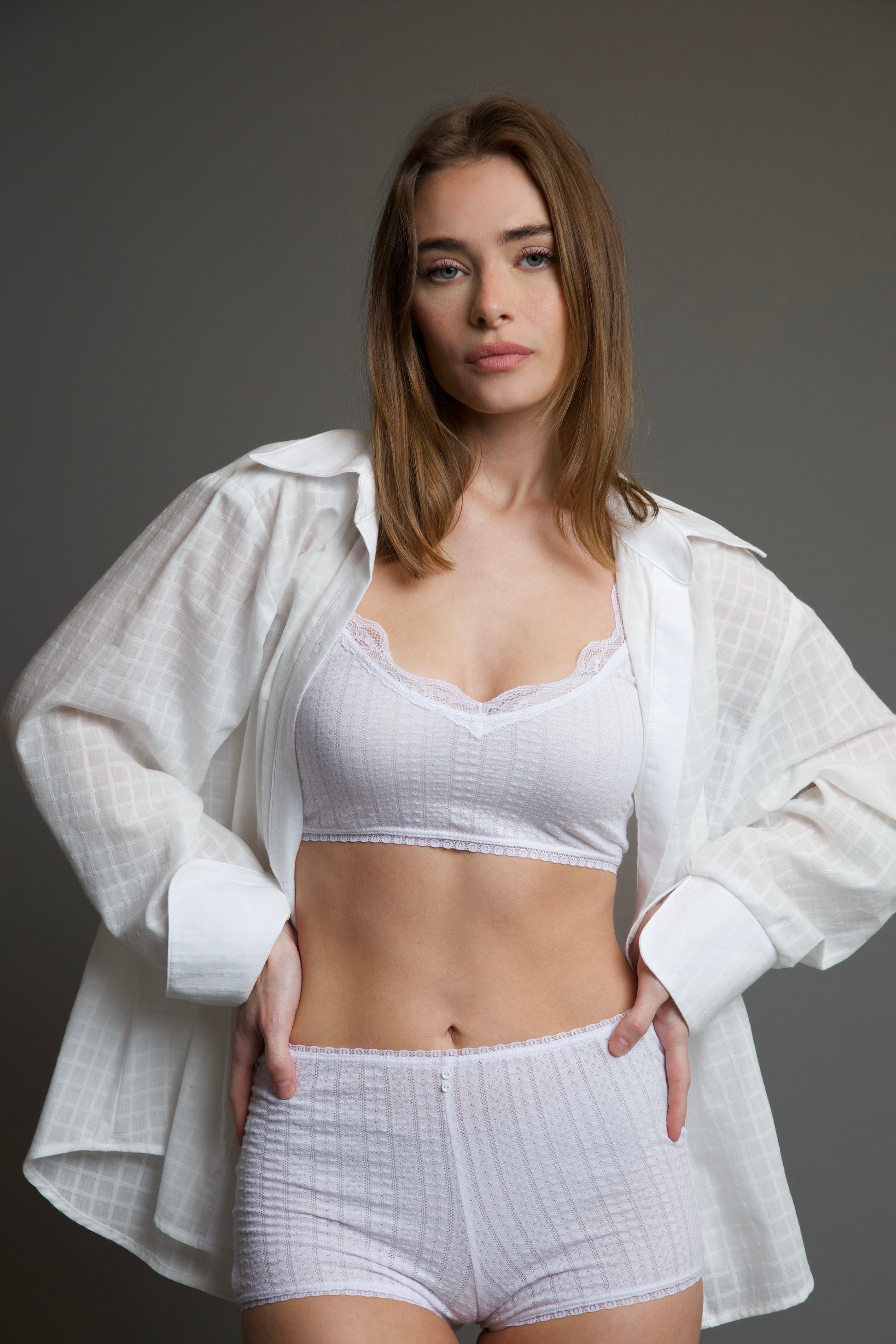 So chic and classic, the Colette Tuscany Crop Tank is a staple basic for any wardrobe. This lightweight tank top is cropped above the waist, fitted with a lace-trimmed scooped neckline, lace-trimmed straps, and features a scalloped lace trim at the waist. The Colette Tuscany Crop Tank is formfitting, yet has some stretch and feels breathable. It is the perfect base for layering or is chic all on its own. Match it up with the Delphine Tuscany Short.
