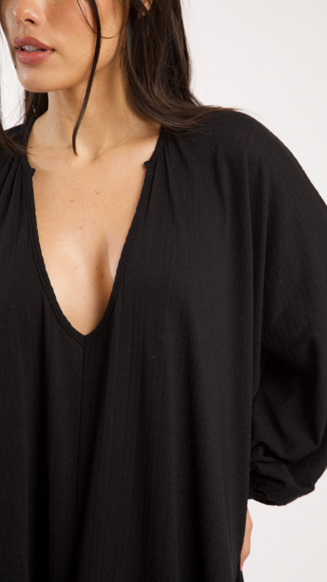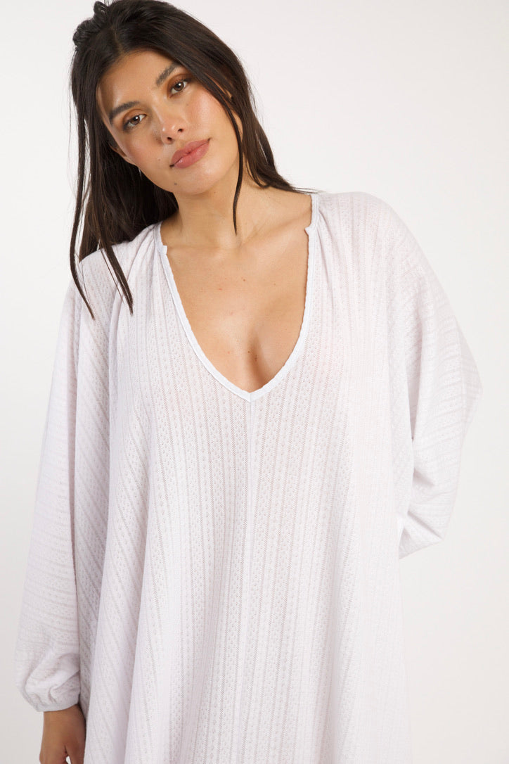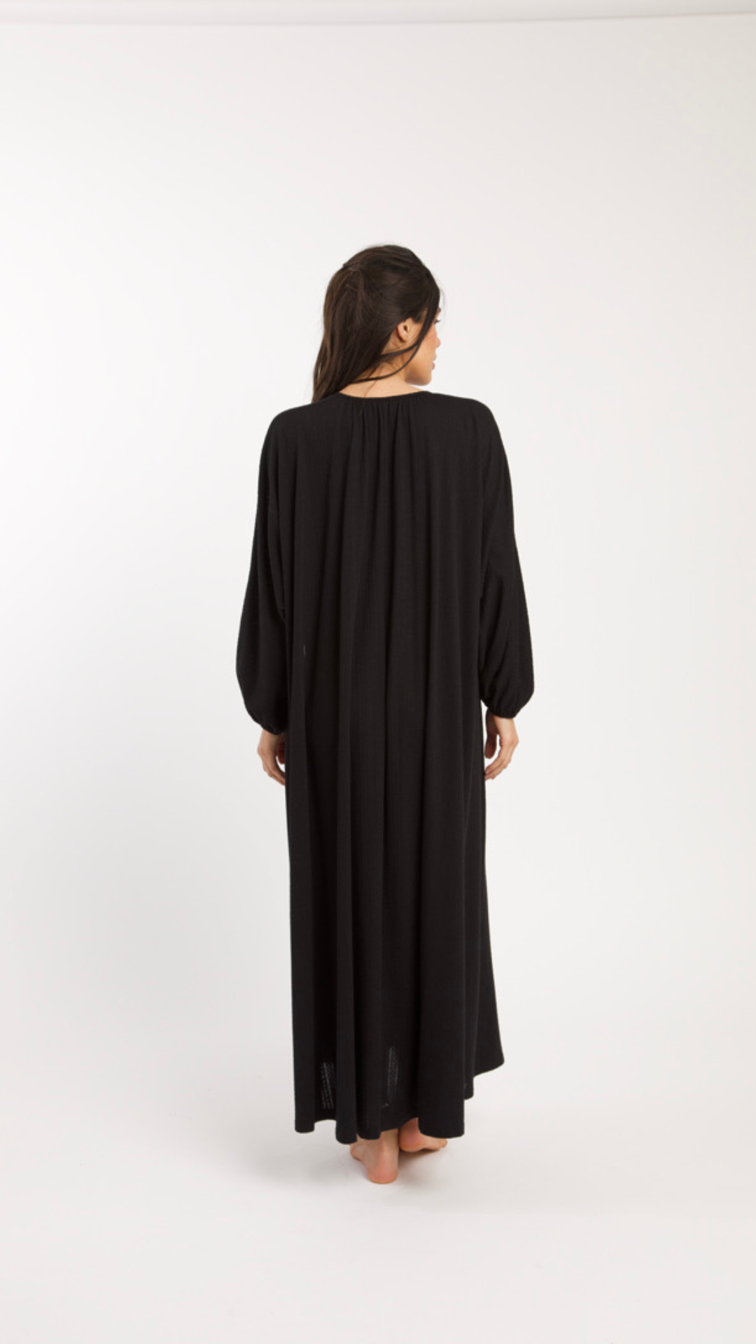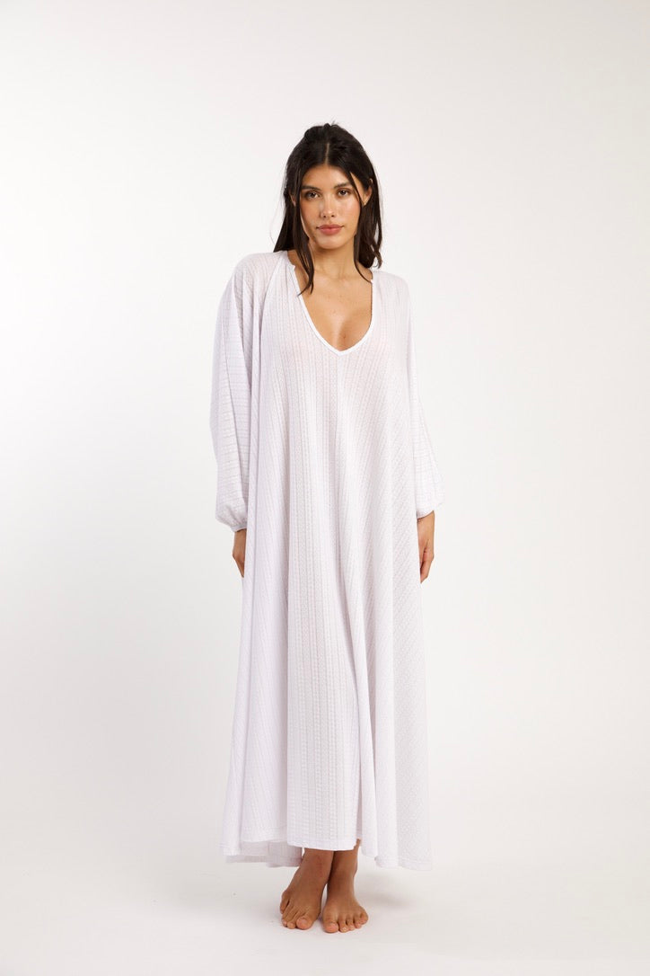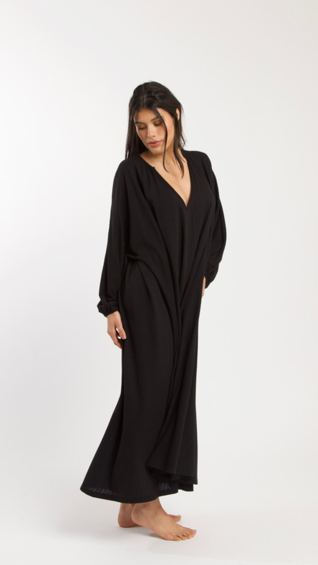 The Luciana Tuscany Long Dress is the perfect dress to throw on, for any mood you might be in. This lightweight and ultra comfortable dress features a deep neckline, a loose fit, long sleeves, and a maxi dress cut. This is the perfect cozy dress for around the house or to accessorize and wear out.