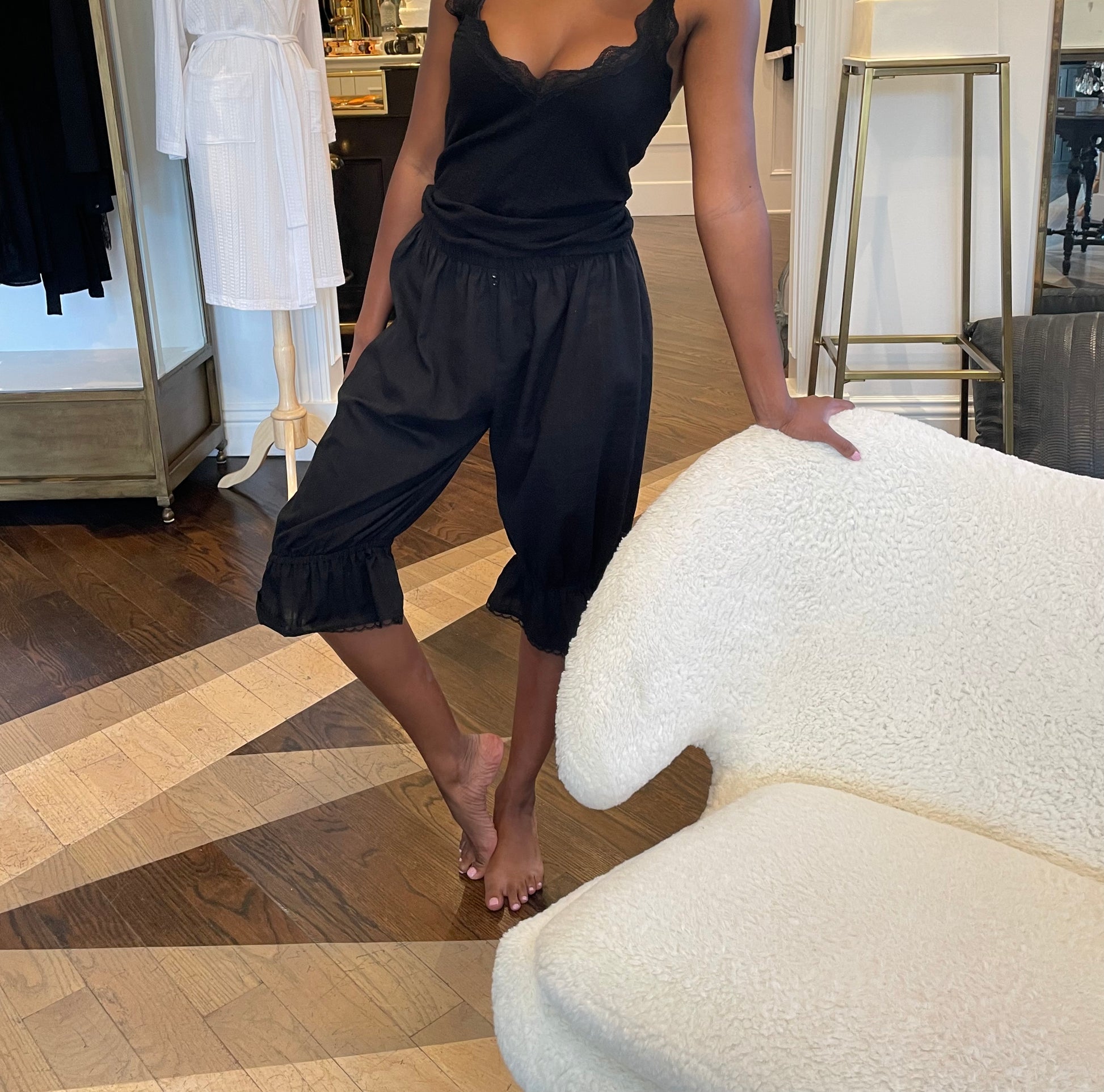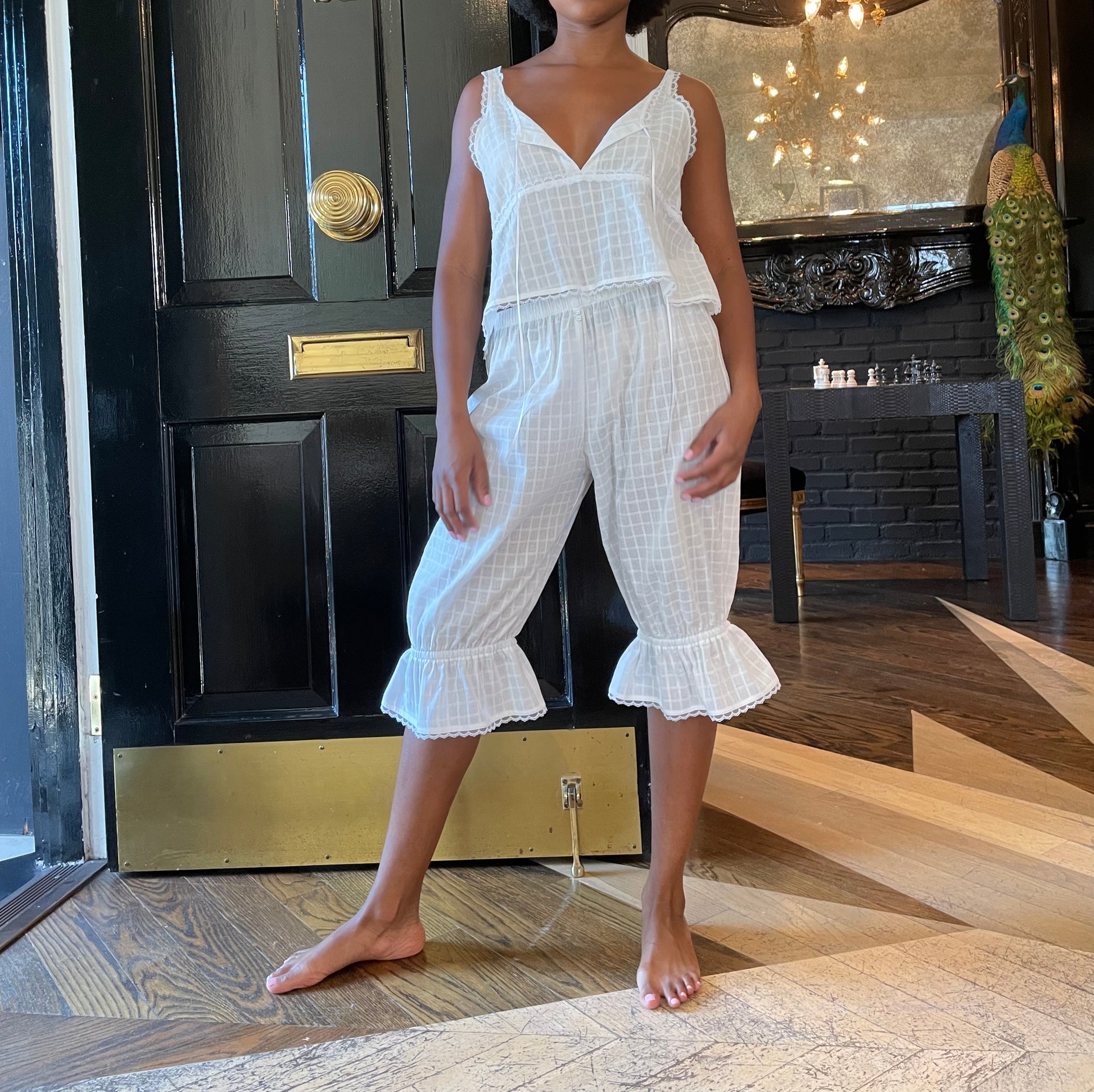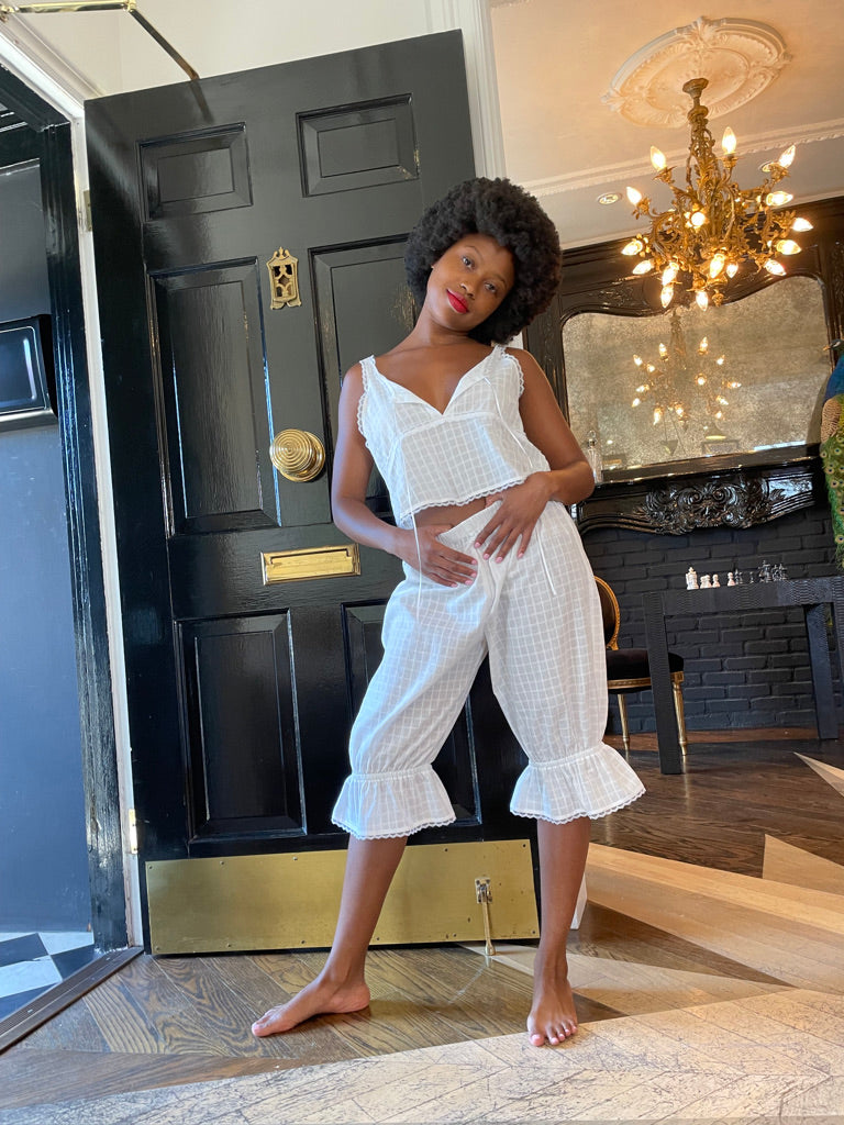 The Akari Check Batiste Bloomer is perfect for lounging around the house in style. This bloomer features an elastic waistband, elastic detailing above the knee with a ruffle at the hem, micro button detailing on the front, and a crop fit just below the knee. Make it a set with the Lulu Check Batiste V-Neck Crop Tank Top.