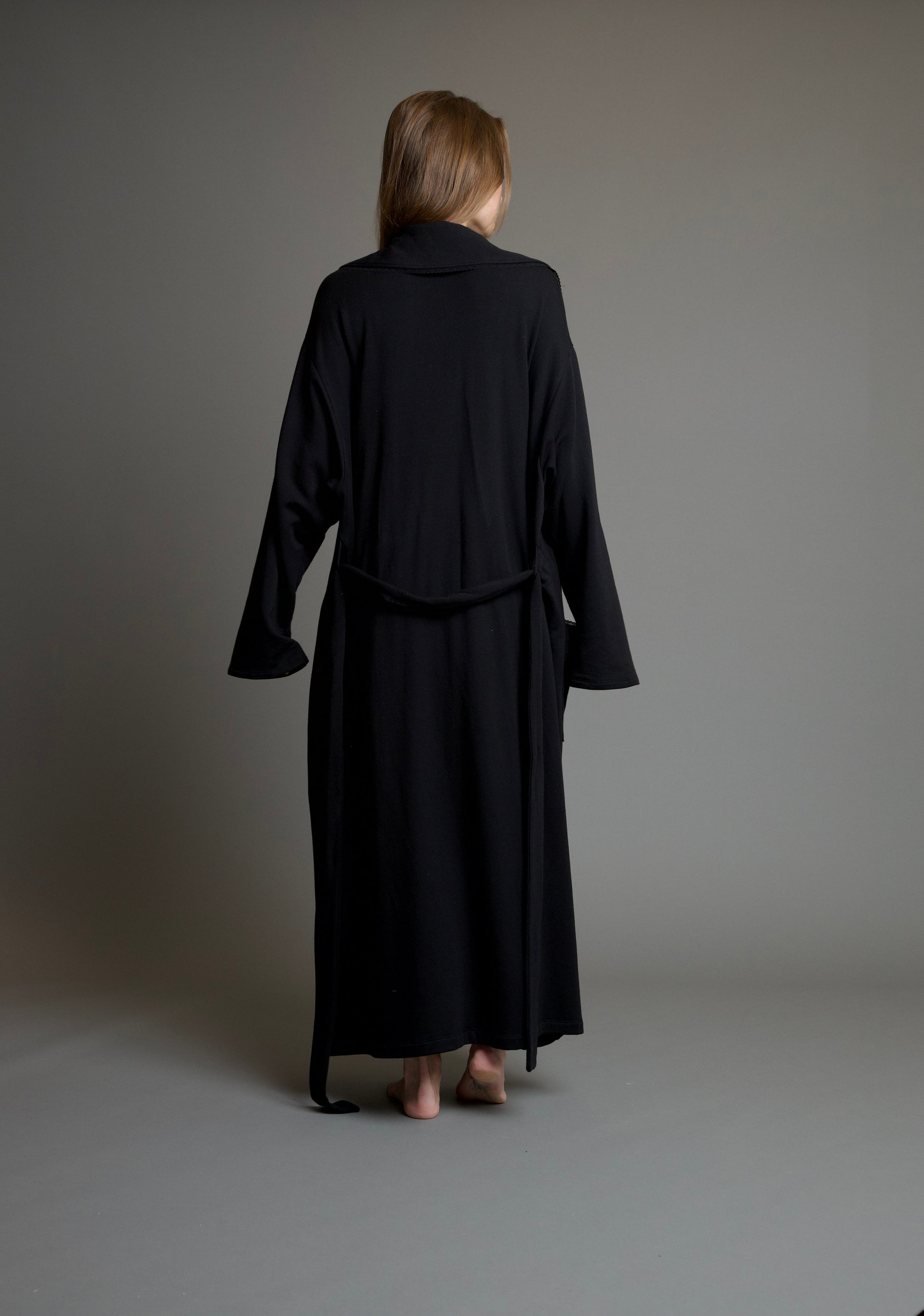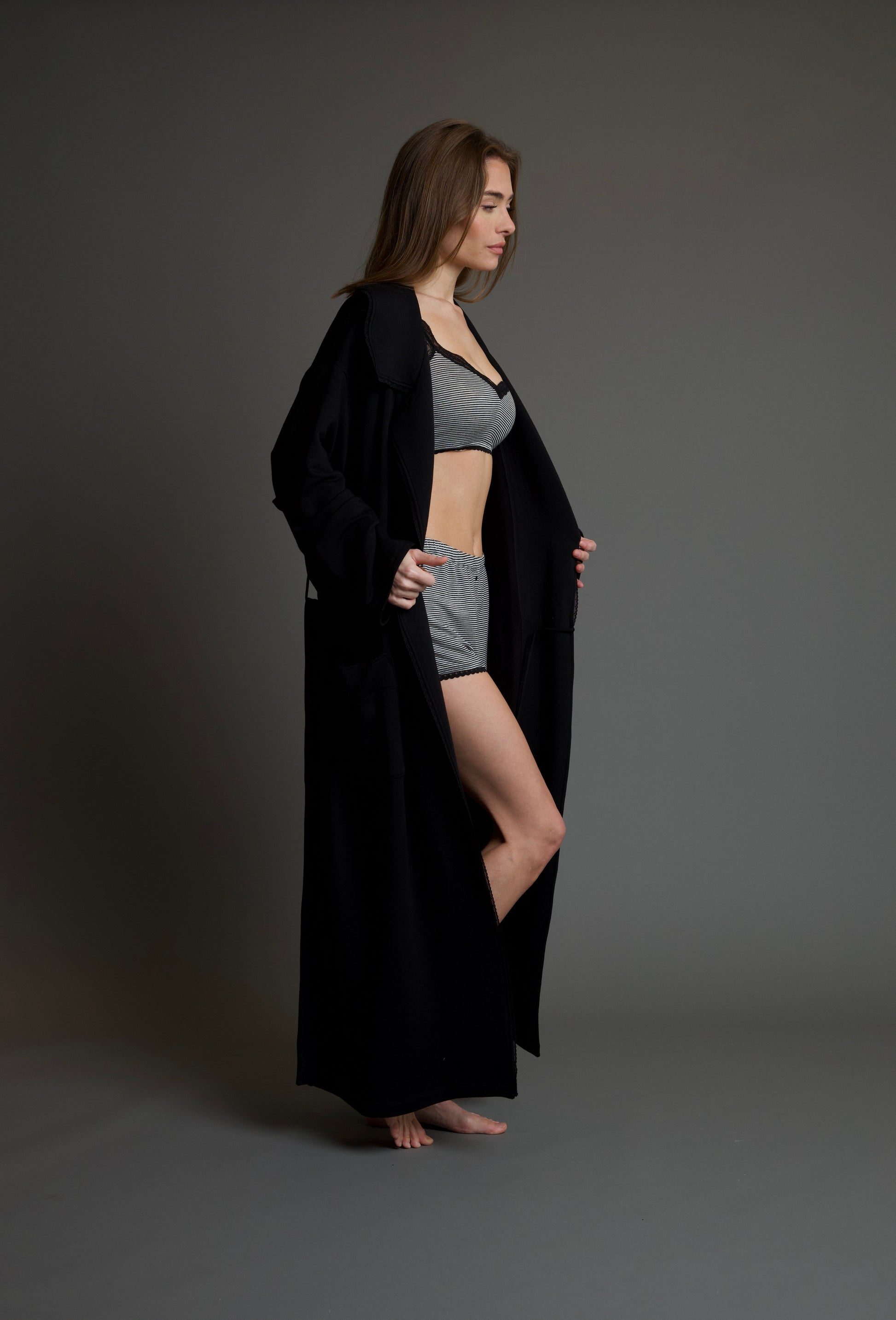 The Brigitte Bologna Robe is a luxurious and comfortable piece of loungewear. This notch collar piece is finished with delicate lace trim, and the robe is secured with an internal tie and tie at the waist. It features long sleeves and is oversized enough that it falls around your feet. We call this the "Mac Daddy" of Robes as it is our stylish take on the Trench Coat.