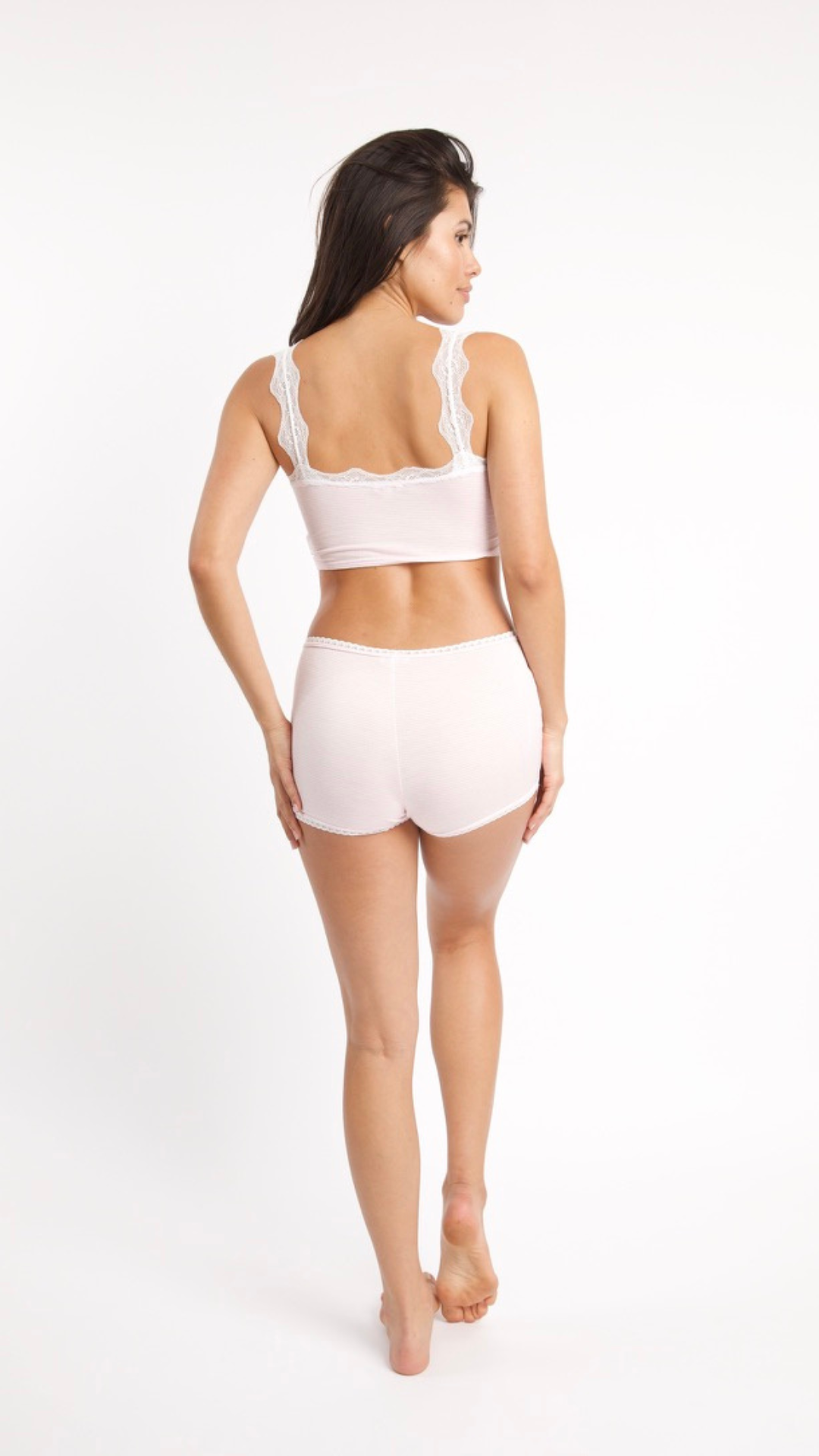 The Colette Positano Crop Tank is a staple basic for any wardrobe, great for layering, dressing up or dressing down. This lightweight tank top is cropped above the waist, fitted with a lace-trimmed scooped neckline, lace-trimmed straps, and features a scalloped lace trim at the waist. The Colette Positano Crop Tank is formfitting, stretchy, and breathable. Perfect for layering or on its own. Make it a set with the Delphine Positano Short or the Anji Positano Boxer.