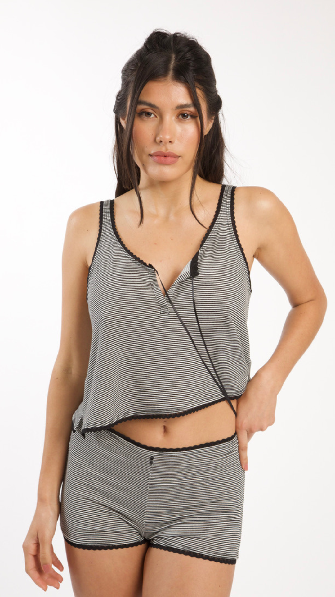The Delphine Positano Short is the perfect lounging short. This lightweight and ultra comfortable short features a lace trim, a relaxed waistband, and a horizontal striped pattern throughout. These shorts are perfect to wear under a sheer outfit, an added short layer, or as a set with the Holland Positano Short Sleeve T-Shirt or the Colette Positano Crop Tank.
