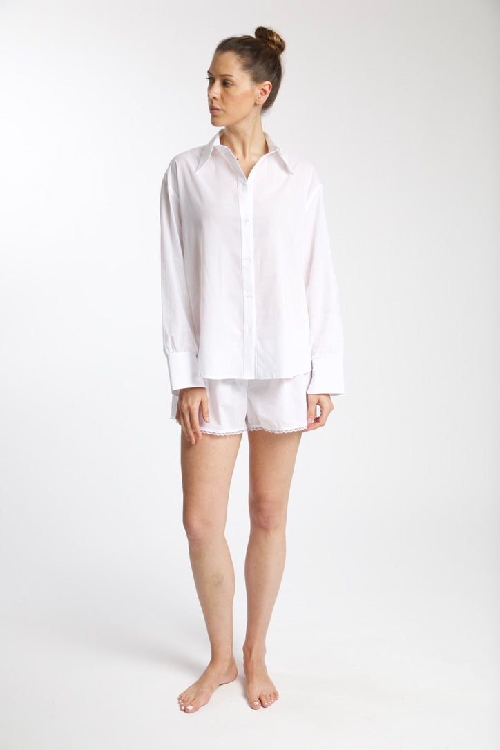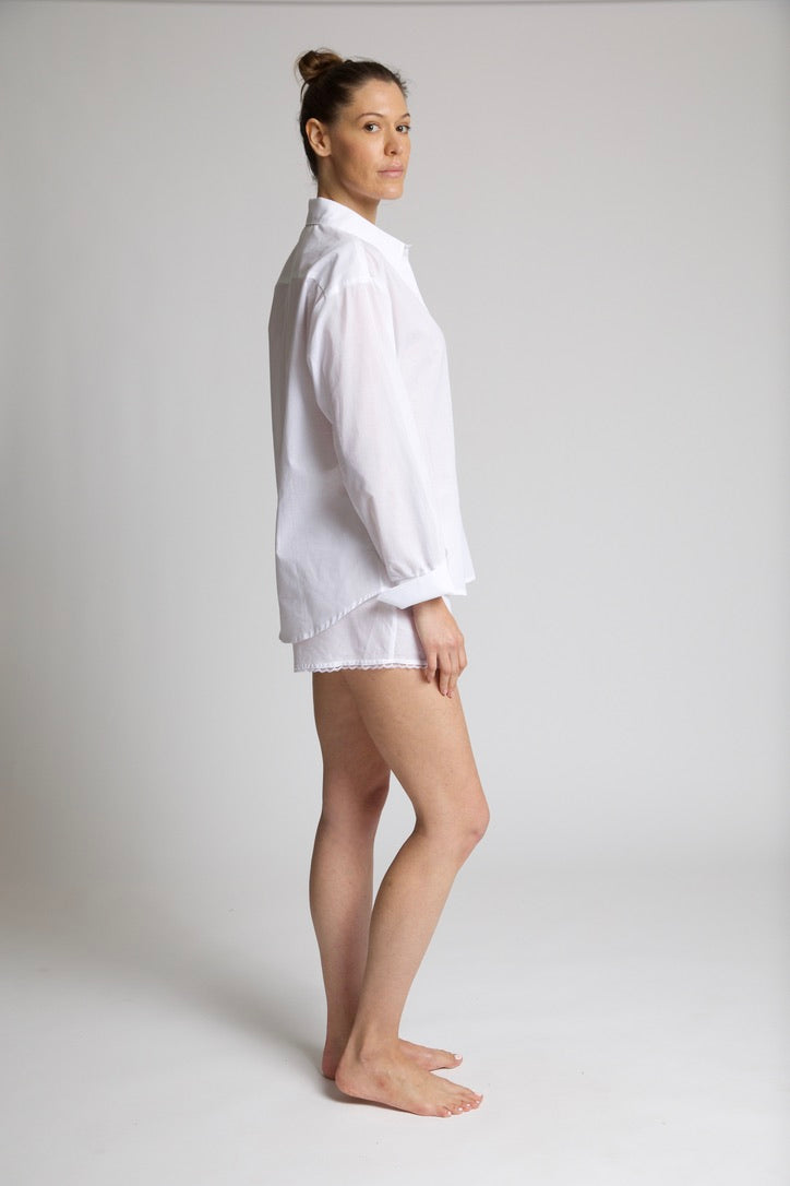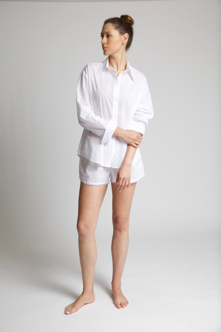 The Gigi Capri Boxer Shorts are the perfect luxury short for both comfort and style. Woven with cotton fabric, these boxers are a must-have in your closet. So chic and timeless featuring an elastic waist, 3 small buttons down the front design and a delicate lace trim at the hem. This light fabric gives these shorts their breathable and comfortable texture while the vertical stripes add to the sophistication of the whole ensemble. Make it a set with our Essen Capri Blouse or the Sia Capri Camisole.