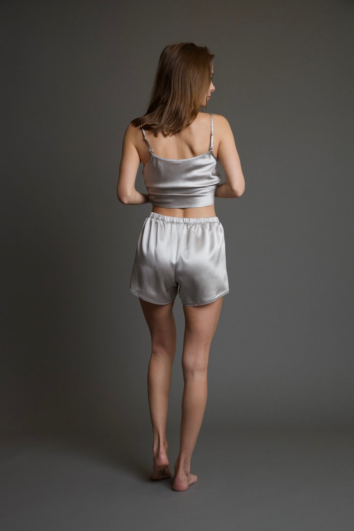 A silky twist one of our best sellers, the Gigi Taormina Boxer Shorts are stylish and comfortable, perfect for lounging at home or to wear out as a set with the Vivi Taormina Tank or the Scaloni Taormina Camisole. This soft and silky boxer features an elastic waistband, front button detailing, and lace trim for Gigi's in Black, Ivory, and Silver. Please Note, the Gigi Taormina Boxer in Fuchsia comes without lace trim.