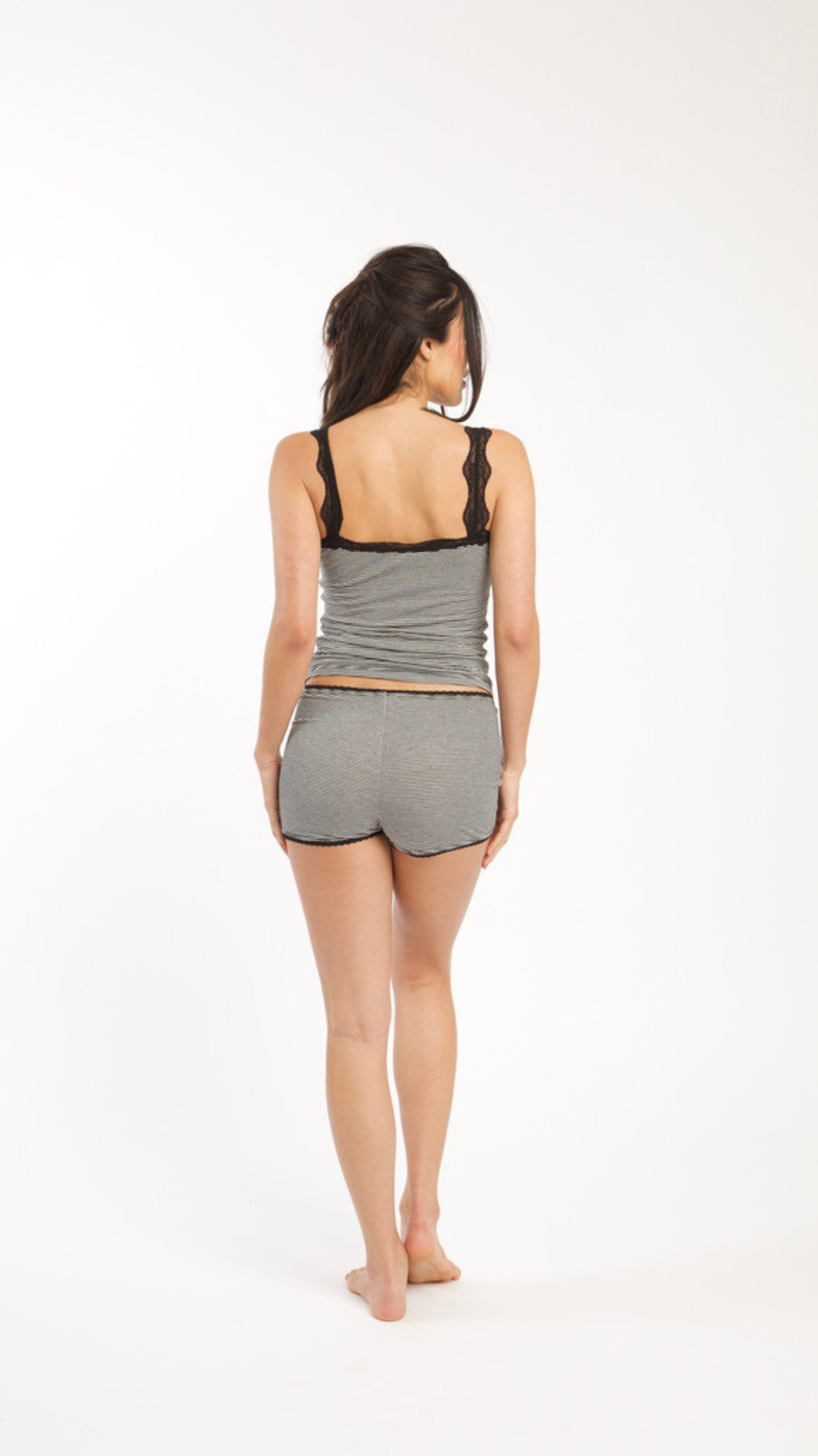 The Mariela Positano Tank is a staple basic for any wardrobe, great for dressing up or dressing down. This lightweight tank top lays at the hips, is fitted with a lace-trimmed neckline, lace-trimmed straps, and features a horizontal striped pattern throughout. The Mariela Positano Tank is formfitting, stretchy, and breathable. Perfect for layering or on its own. Wear this tank top with your favorite pair of jeans, or make it a set with the Anji Positano Boxer, Soleil Positano Pant, or Delphine Positano Short.