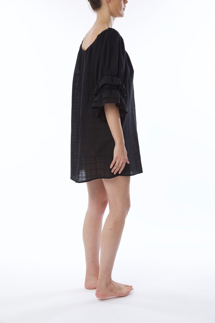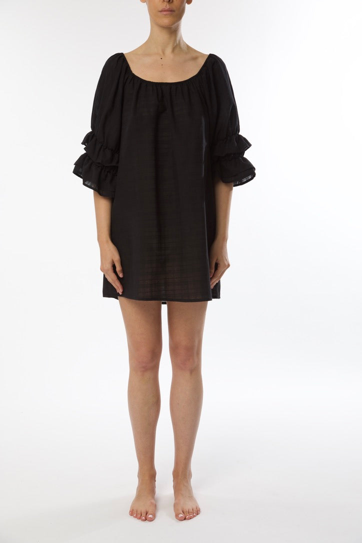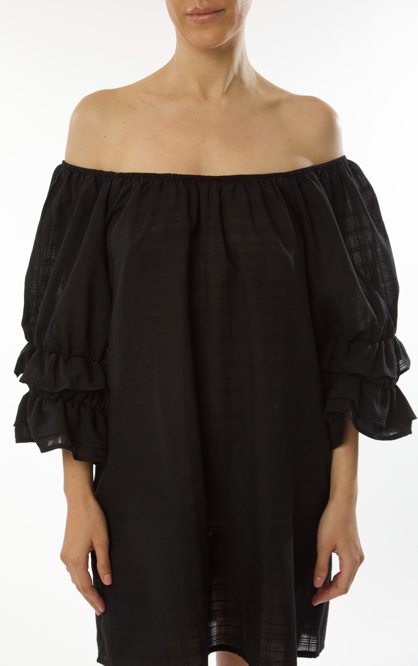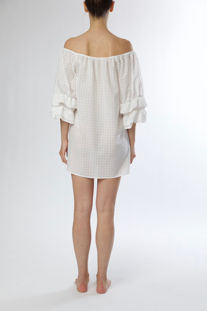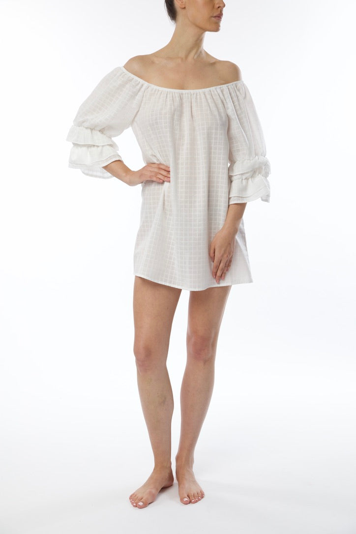 Introducing the Romande Marseille Ruffle Dress. This chic, light and airy chemise dress features a ruffled 3/4 length sleeve, an off the shoulder elastic neckline, and has an overall loose fit for an effortless look. Perfect to dress up for dinner or dress down as a beach coverup. She is a showstopper and will be everywhere this summer!