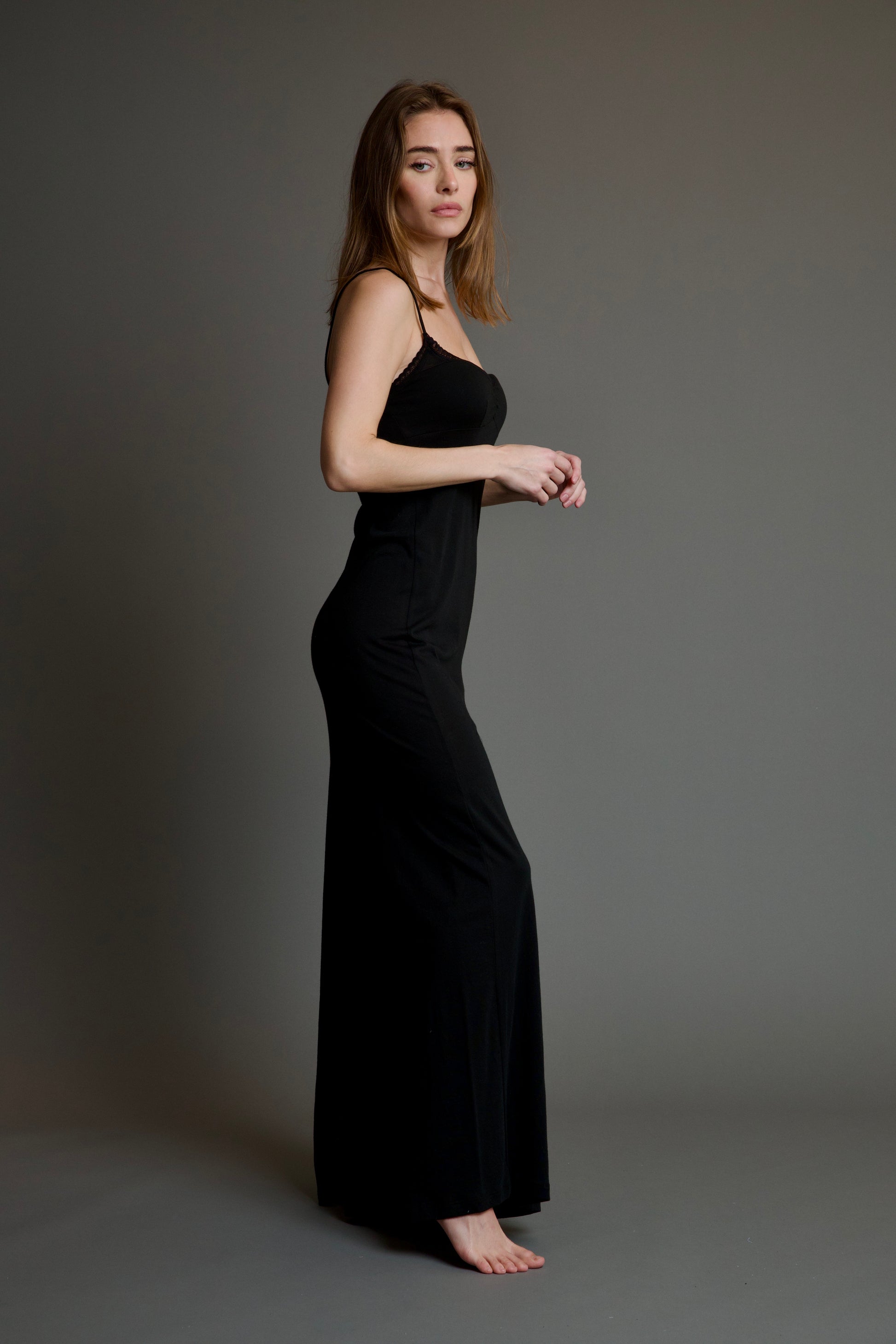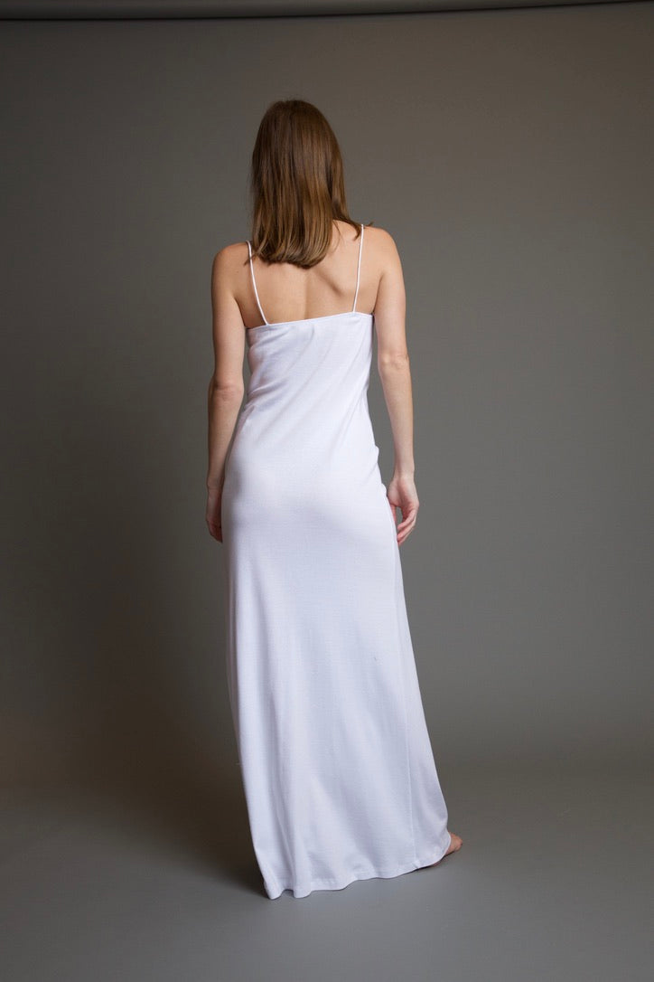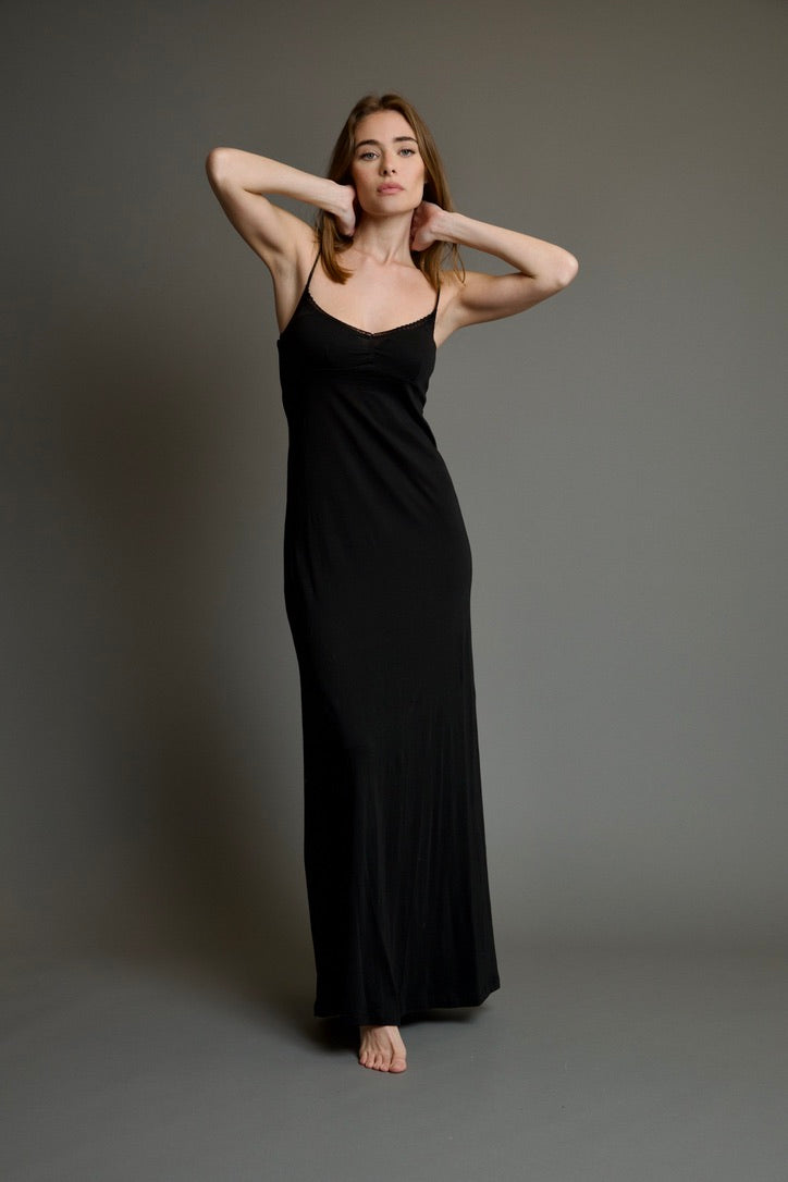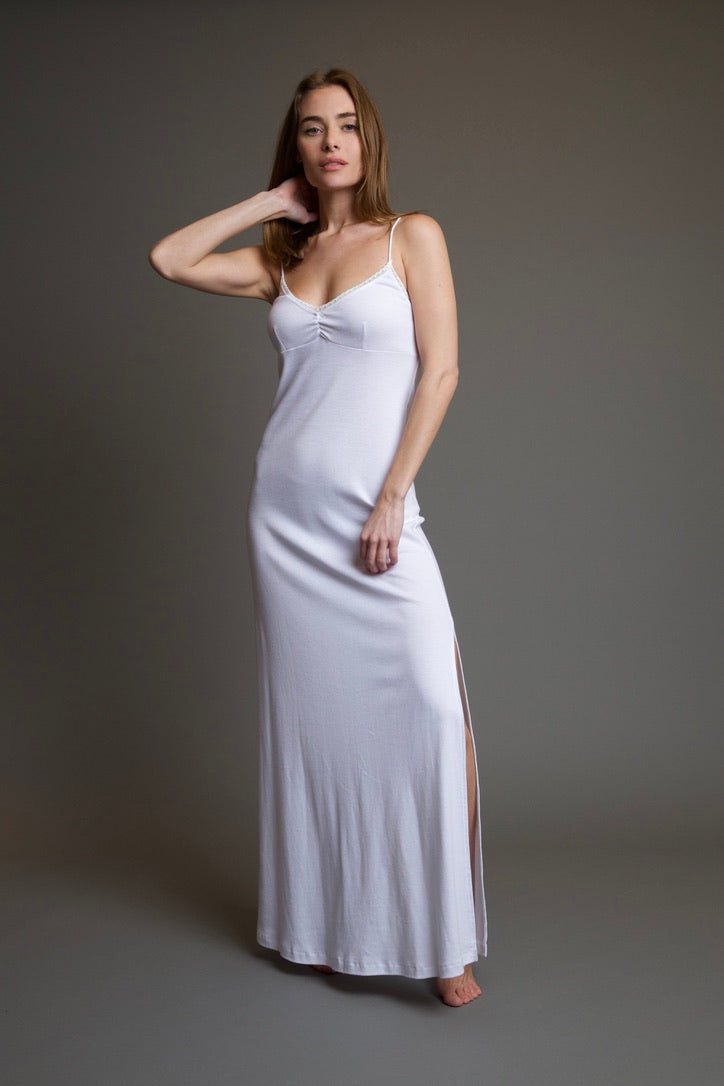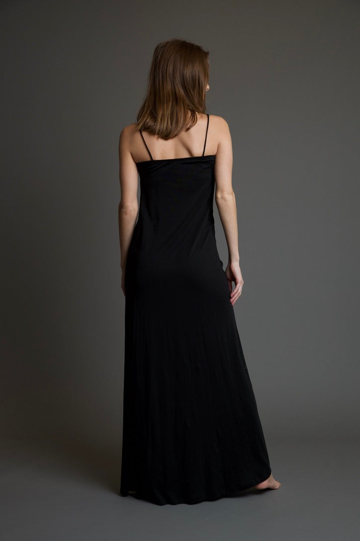 The Sophie La Plata Long Dress is the perfect lounging dress. This lightweight and ultra comfortable long dress features a lace trim, a slit at the bottom, spaghetti straps, flattering shaped detailing along the front, and a maxi dress length cut. This dress is perfect to wear around the house, or out on the town!