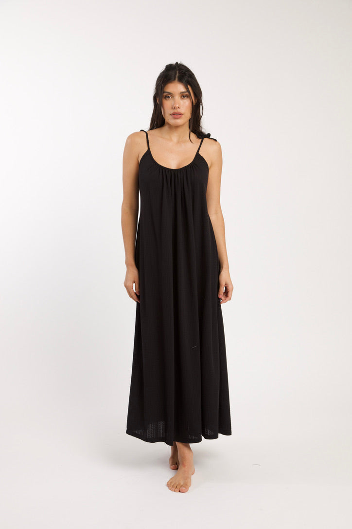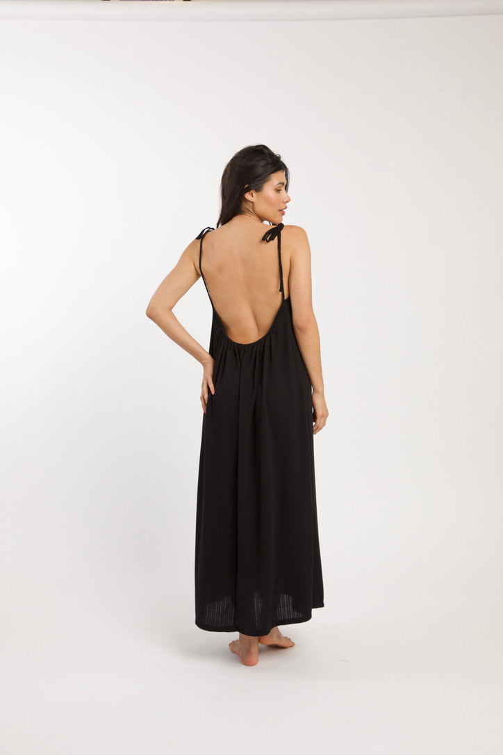 The Sydney Tuscany Backless Dress is the perfect dress to wear around the house, yet is versatile to be seen out on the town. This lightweight and ultra comfortable dress features a scoop neck, tie string straps, a horizontal stripe pattern, a maxi dress cut, and a backless design. This is the perfect dress for summer, whether you're at home or walking around on vacation.