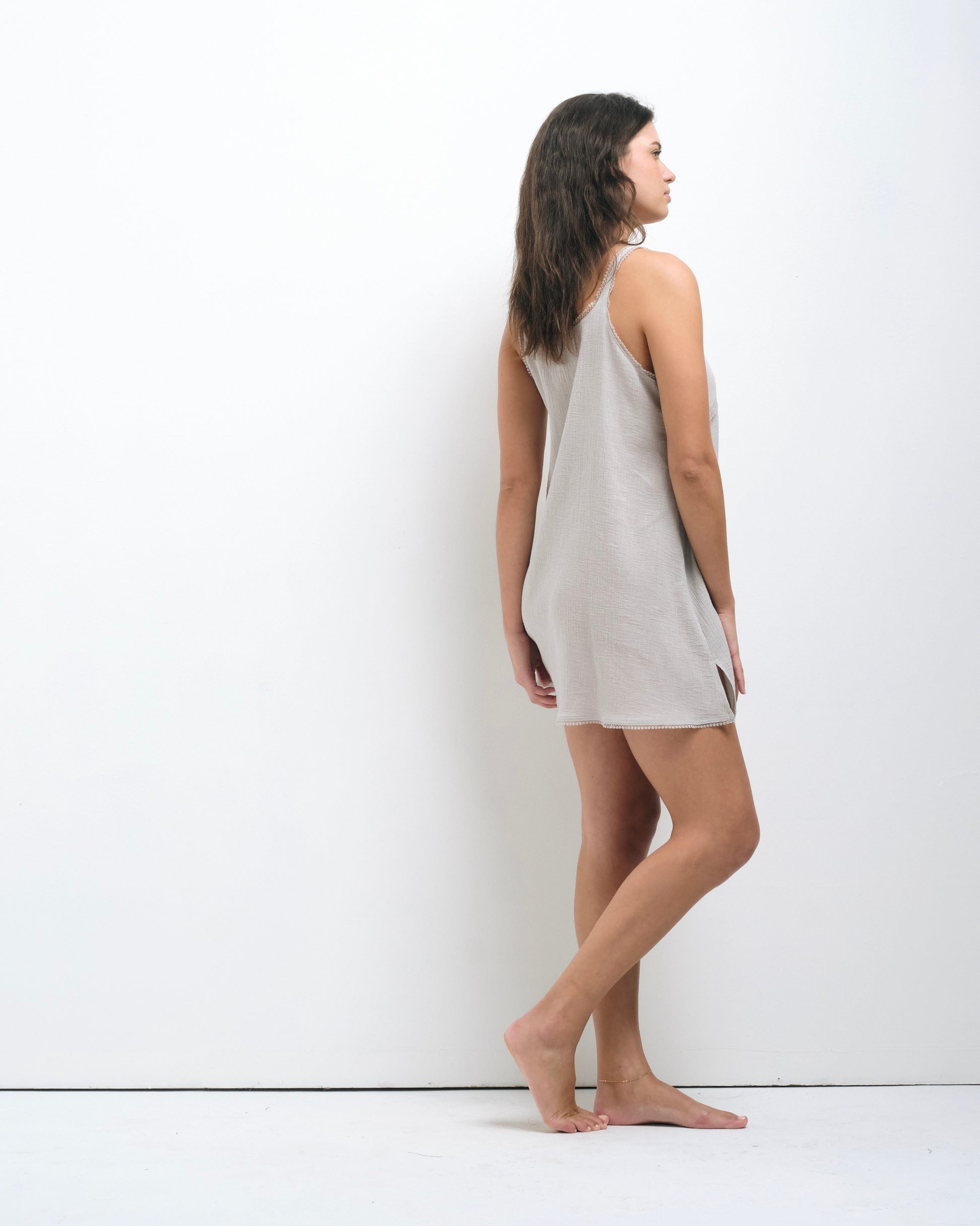 The Vionette Bastia Chemise is stylish and comfortable, perfect for lounging at home or to wear out on a sunny day. This dress features a lace trim, satin ribbon ties at the front, fits loose around the body in an a-line fit.