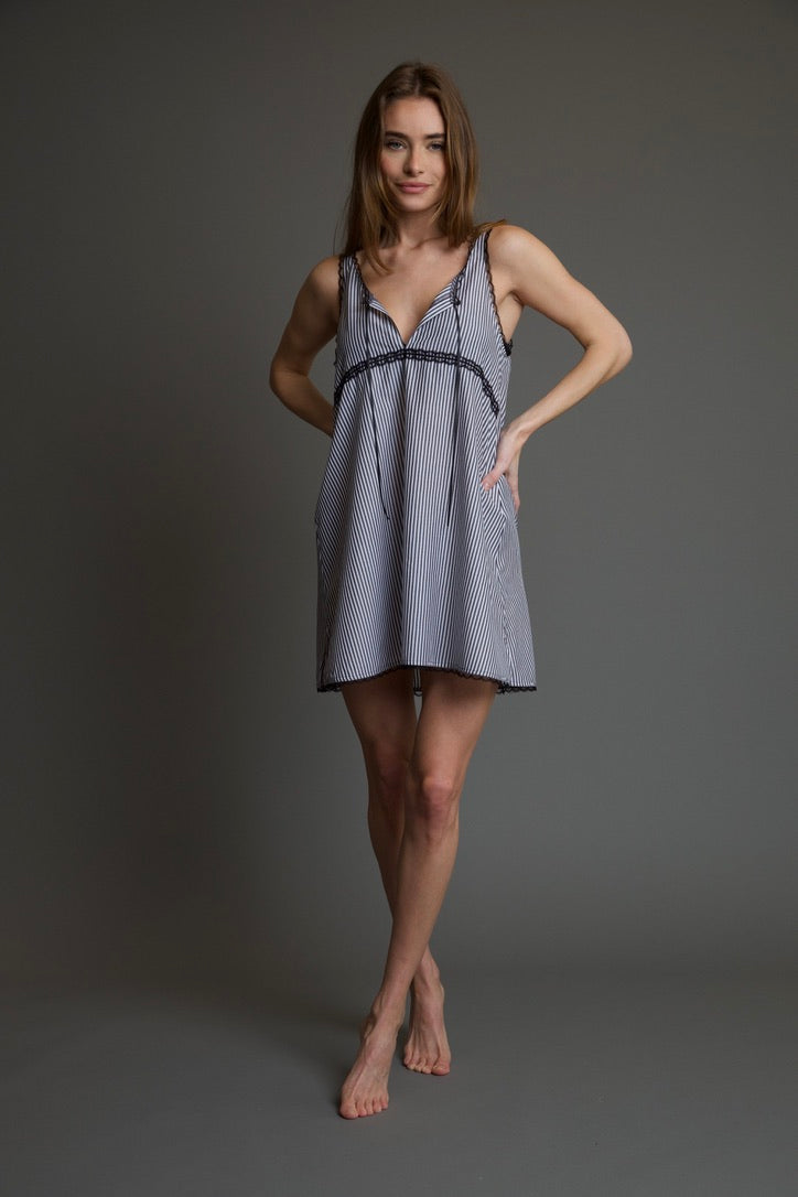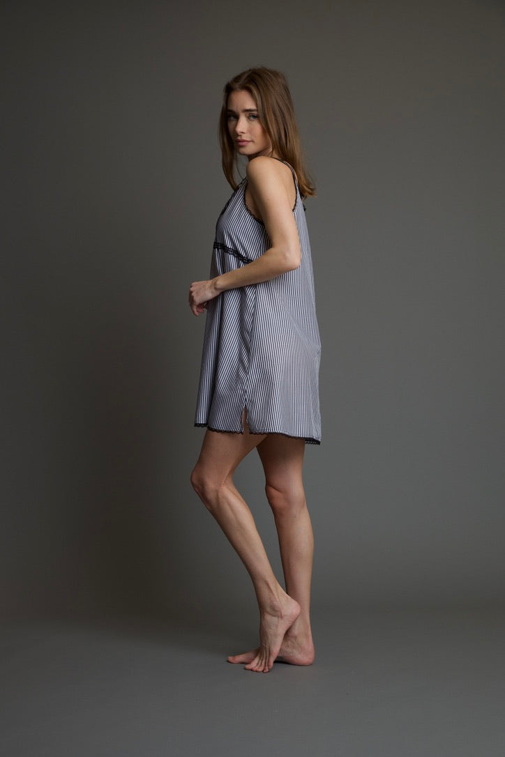 The Vionette Monaco Stripe Chemise is stylish and comfortable, perfect for lounging at home or to wear out on a sunny day. This dress features a lace trim, satin ribbon ties at the front, fits loose around the body. Wear the Vionette Monaco Stripe Chemise at home, to the beach, or out on the town.