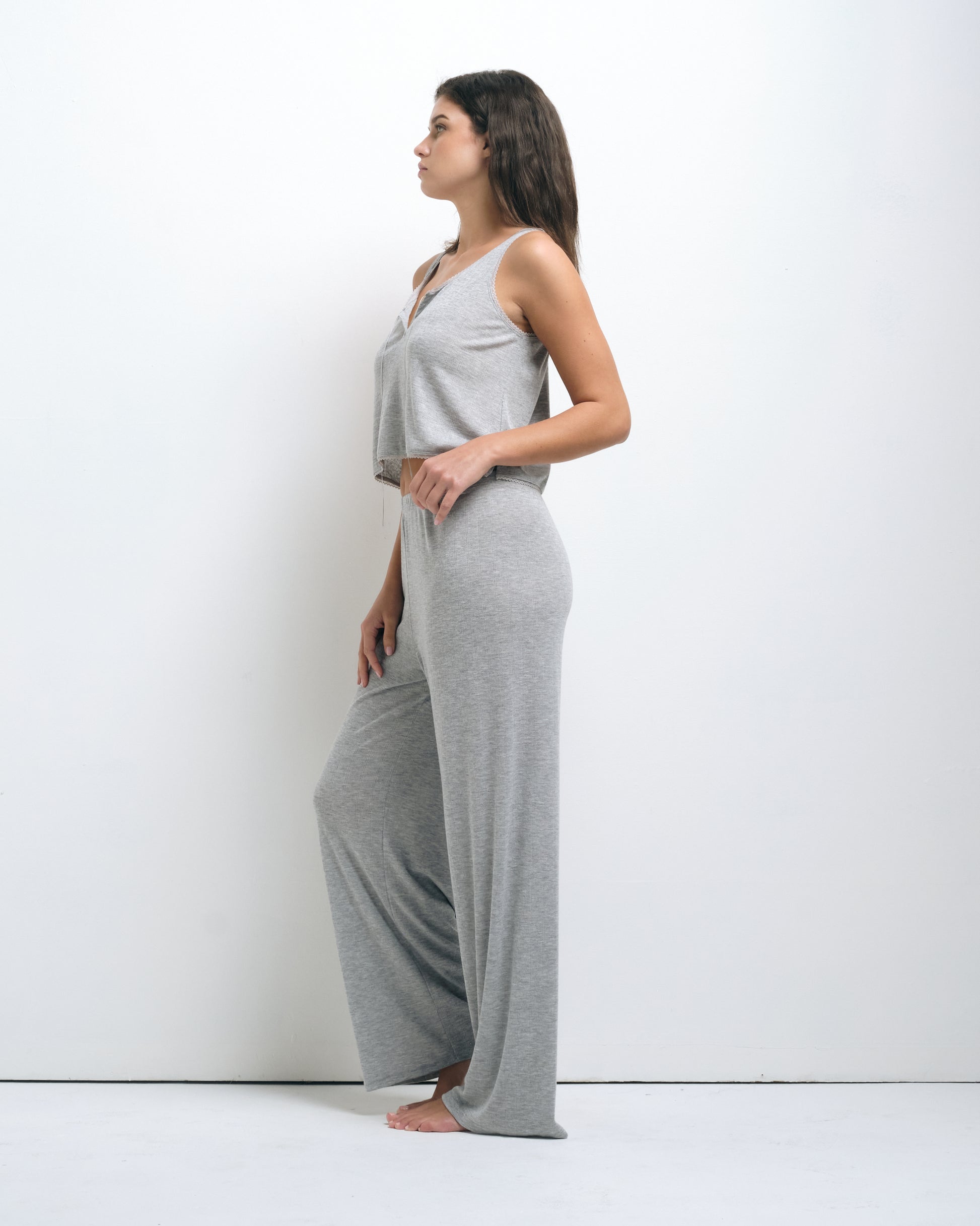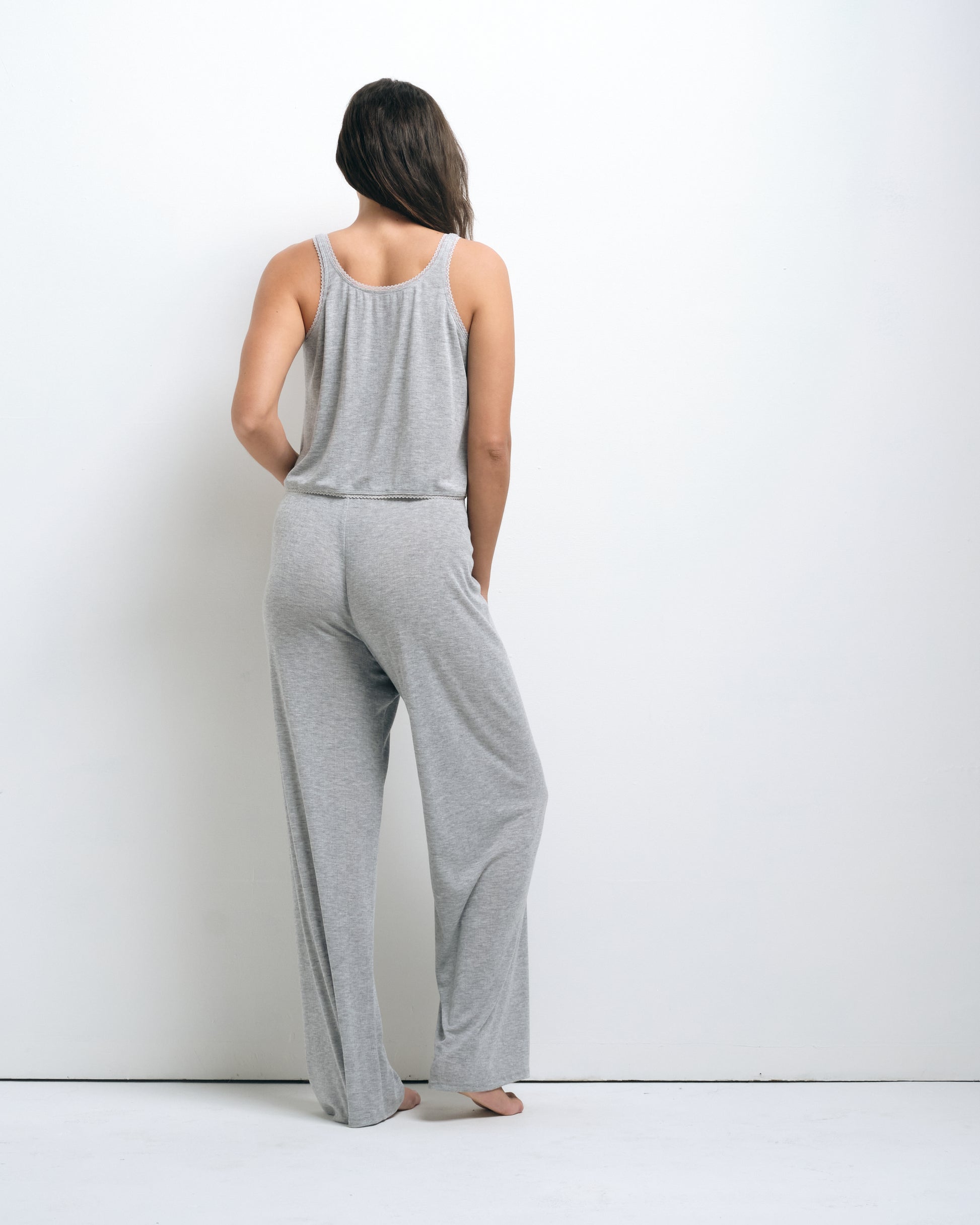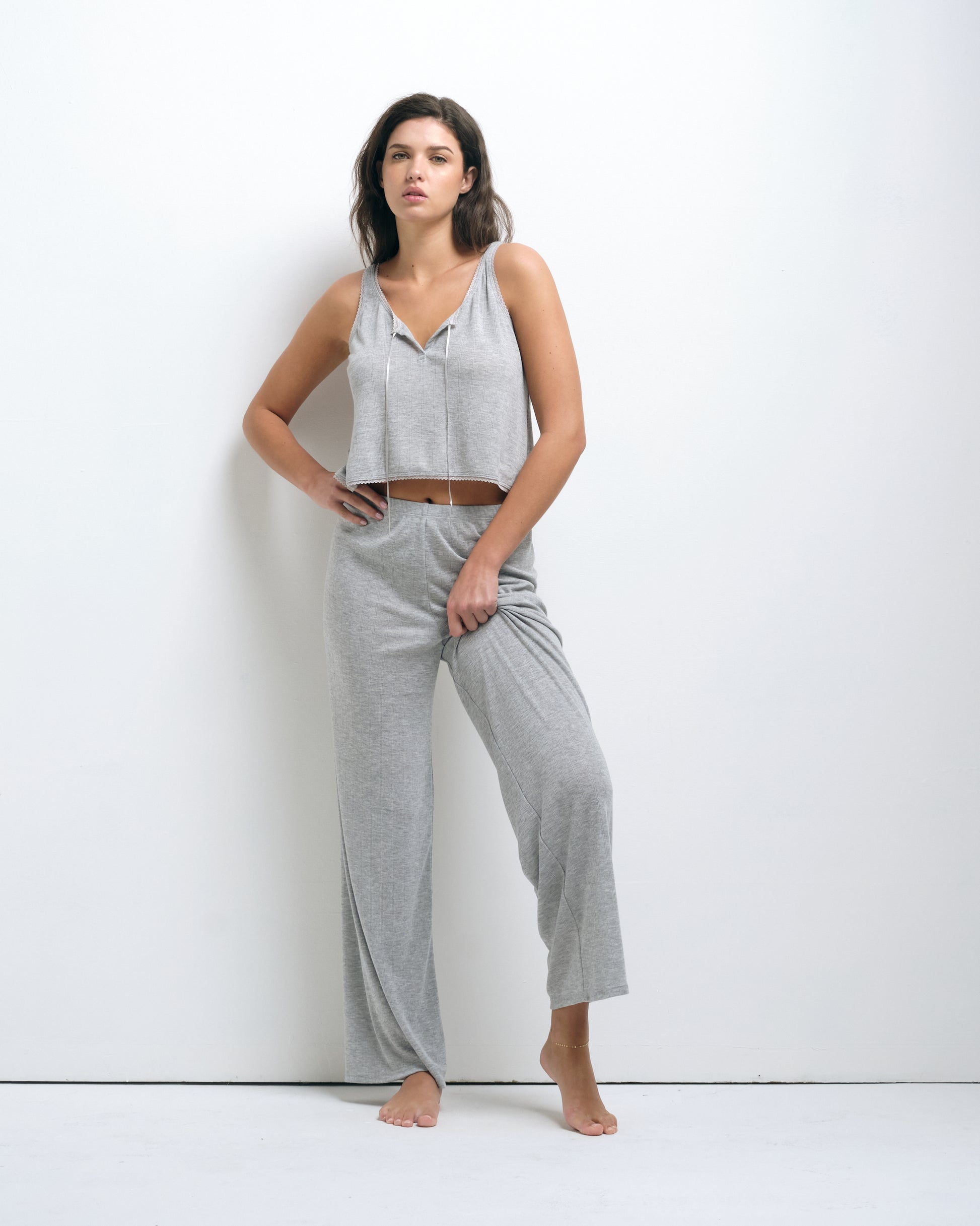 The Vivi Antibes Tank is a staple basic for any wardrobe, great for layering, dressing up or dressing down. This lightweight tank top is cropped at the waist, fitted with a lace-trimmed v-neckline, lace-trimmed straps, lace trimmed bottom, and a tie front. The Vivi Tank features a relaxed fit and is perfect for lounging or pairing with your favorite pair of jeans. Make it a set with the Soleil Antibes Pants or the Otamendi Antibes Boxer Shorts.