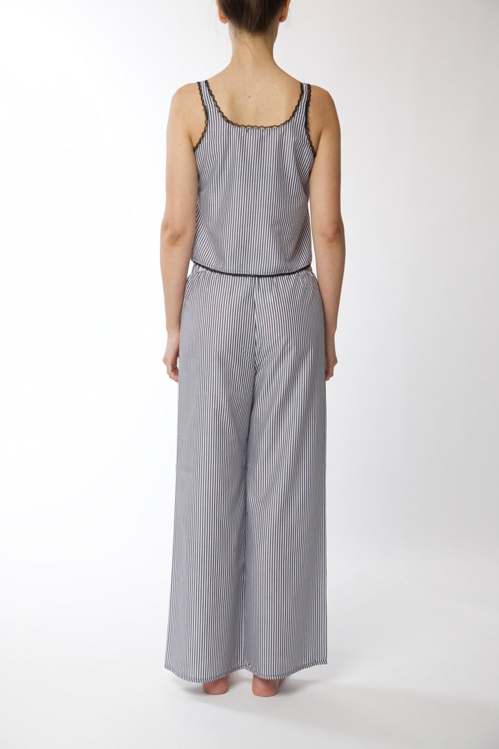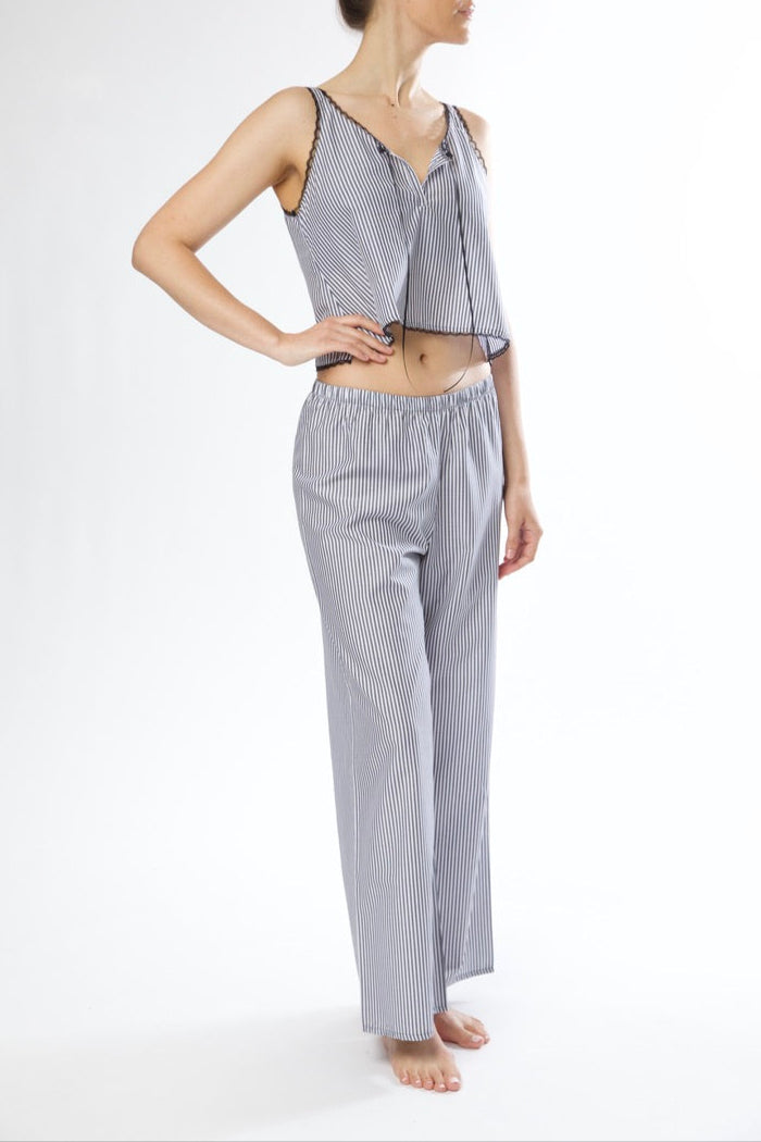 The Vivi Monaco Stripe Tank is a staple basic for any wardrobe, great for layering, dressing up or dressing down. This lightweight tank top is cropped at the waist, fitted with a lace-trimmed v-neckline, lace-trimmed straps and bottom hem, along with ribbon ties in front. The Vivi tank features a relaxed fit and is perfect for lounging or pairing with your favorite pair of jeans. Make it a set with the Gigi Monaco Stripe Boxers or Cavani Monaco Stripe Pants.
