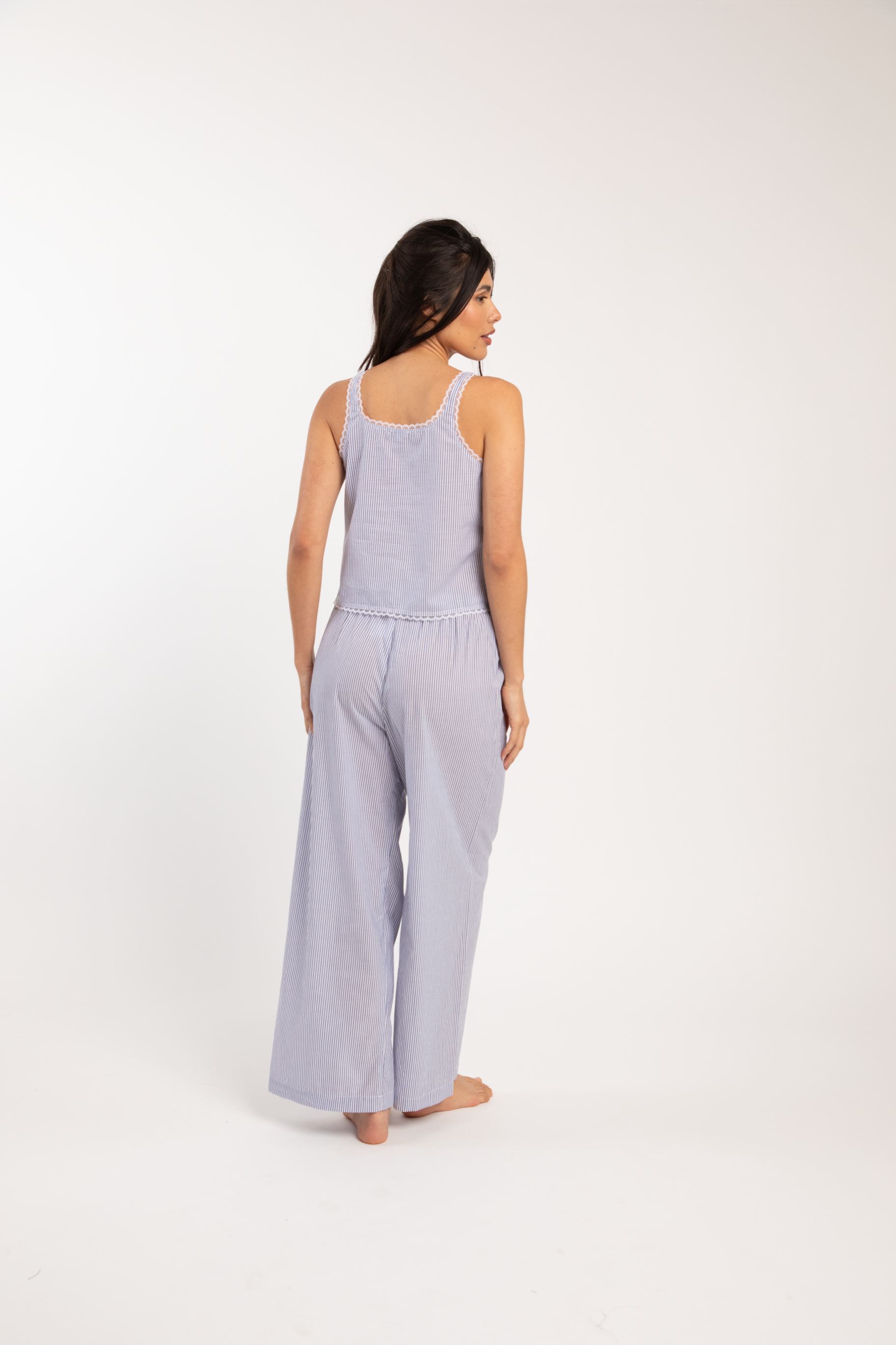 The Vivi Provence Stripe Tank is the perfect luxury item that can be worn both inside and outside of the house. This lightweight tank top is cropped at the waist, fitted with a lace-trimmed v-neckline, lace-trimmed straps, lace trimmed bottom, and a tie front. A cozy at-home must and the perfect shirt to toss on with a pair of jeans, this tank belongs in your closet. Make it a set with our Gigi Provence Stripe Boxer or the Cavani Provence Stripe Pant.